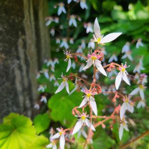 ユキノシタが満開です。 半日陰で控えめですが、日陰特有の濃い緑のなかでは静かに咲くこの白い花が似合います。