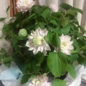 義母にあげたクレマチス咲き出しました。 思ったより小さい花でした。 でも、八重咲きです。