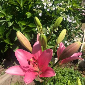 昨日から咲き出した百合さん たくさん蕾付いてます。 一番大きい子ピンクが鮮やか😃💕