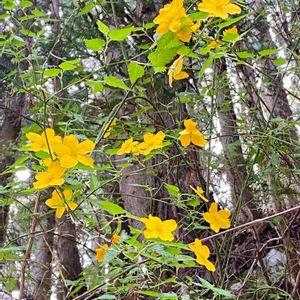 昨日、山の中を運転中、見かけたヤマブキ(山吹)の花です。 杉木立を背景に、曲線を描くように咲いていました。自然のままに枝を伸ばしていて、まるで、つる植物のようなしなやかさ、そしてこの色、とてもきれいでした✨🧚♂️