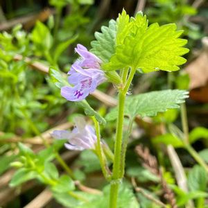 カキドオシ(垣通し)でしょうか? 葉は対生し、丸っこくて可愛いです。 中央裂片は大きく前に突き出し、濃紫色の斑紋と白い毛が目立ちます。