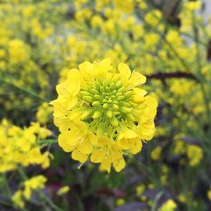 ご近所を娘と散歩していたら、菜の花畑を発見! 綺麗だなぁと思ったけど、よく見てみたら葉っぱが赤紫色!! これは何という植物なんだろう? (花拡大)