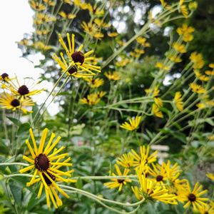 ルドベキア ヘンリーアイラーズ💛 一昨年植えた一株がとても大きくなりました。 午前中は大雨で、水路が溢れ田んぼが冠水しています。 お昼頃から雨が止み青空が少し出てきましたが、今またゴロゴロ鳴ってます⚡ ひゃあ☔急にバラバラ降ってきました。