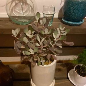 カランコエ 白銀の舞という綺麗なお名前がついていました。お花がついているの初めて見ました。素敵な鉢と合ってとてもお上品ですね🥰