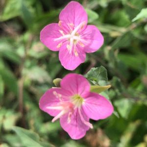 マツヨイグサと同じ仲間で、ユウゲショウという和名だけれども、昼も咲いているのでまぎらわしいお花です😊 昔、紅白一ポットずつ苗を買って鉢植えにしたのですが、それからずっと毎年駐車場のアスファルトの隙間から出てきて咲いてくれます。ほぼ雑草のように出てくるので、邪魔な場所のは抜いたりしますが、花壇のほうには全く出て来ないのは、駐車場の環境のほうが合っているのでしょうね💦