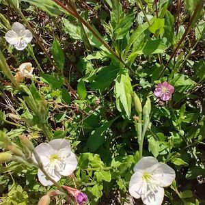 アカバナユウゲショウの白花。 通勤路の脇に生えてるのを見つけて、そーっと抜いて職場の花壇に。 根付いたようで、次々咲いてます☺️