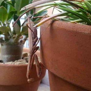 今日の主。カマ吉改めカマ美。 最近見ないな?と思ってたら、室外機の上のアガベ鉢に。 保護色です。 いると産卵されそうで不安だし、いないといないで死んじゃったの?と心配だし…