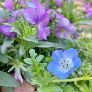 庭のオリーブ下花壇のビオラの隙間から、去年植えていたネモフィラの零れ種が咲いていました(*´◒`*)🩵