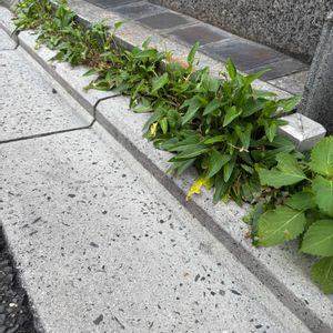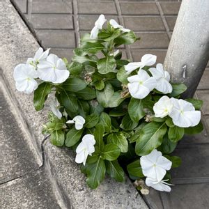 ここ、実は花屋さんの店先。歩道を挟んで店の前には花苗が並べられています。 売り物にされるのが気に入らなかったのか、咲く場所は自分で選びたかったのか。 店主さんからすれば 「勝手にしろ」 って感じ? 車道側から花屋さんをバックに撮りたかったけれど、交通量多めだったのであきらめました。