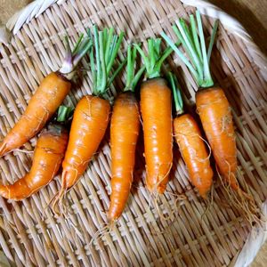 人参、掘り上げました🥕 まずまずのでき具合☺️ 去年の失敗から、早めに肥料をいれて土作りしました。 ◯◯星人は、あまり居なかったけど割れたものがたくさん……😢 これは天候相手なので仕方ないか😵 込み合った所はやっぱり小さめ、 間引きも大事ですね🍀