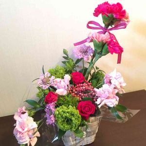 体験レッスンでお作りいただきました 初めてアレンジメントを作る方にも お花の楽しさが伝わるといいな ピンク色に若草色をプラスして春らしく