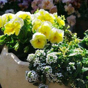 〈パンジーフリルフロマージュ モニター報告〉⑨ アリッサムを挟んで二株植えてますが、片方がわんさか咲いてます 黄色に白の縁取りのフリフリ可愛らしいこと もう一株も蕾がついてきて咲き始めてます 同じ鉢の中でも差があります なので、バランス悪い寄せ植えになってます(^^;) 花のサイズは相変わらず小ぶり(3㎝程)ですが、好みの大きさです