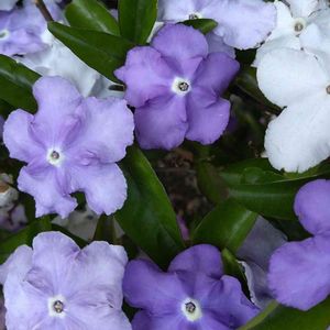 ニオイバンマツリ: 実家の庭に鉢植えであります。 毎年咲き出した時は紫で咲き終わる頃は白くなる ナス科 ブルンフェルシア属 常緑樹。 初夏から夏にかけて花が咲く。漏斗状の花弁で5弁に開く。 花は咲き始め濃い紫色で、次に薄い紫色、最後は白色になる。強い芳香がある。 葉は互生し革質で光沢がある。 和名の匂蕃茉莉は、匂があり、蕃からの、茉莉の意味で「香りのある外国からのジャスミン」を意味する。