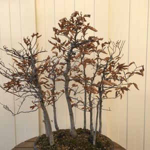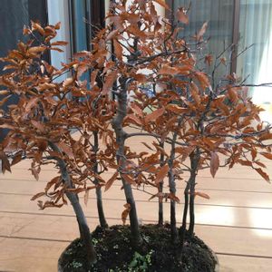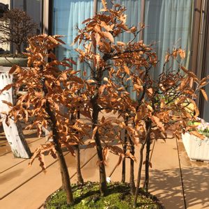 冬場の雑木盆栽を見てください。 ブナの寄植え盆栽です。樹林に見えますか? 枯葉が残っています。例年であれば4月頃に葉が落ちて新芽🌱と入れ替わります。