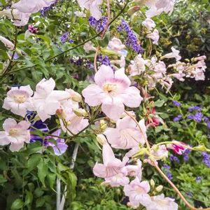 淡い桃色のノウゼンカズラです。 よく見かけるオレンジ色のノウゼンカズラの半分くらいの小花で可愛らしいです。 そろそろ終盤かと思いますがまだ元気花たくさんあります🥰‼️