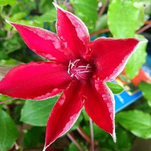 クレマチス ヌビア 春の花後に見切り品になってきたので買ってきた株です 花芯まで真っ赤です 手前の葉っぱはジューンベリーのものです