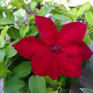 クレマチスヌビアも真っ赤に開花しました レベッカは花芯が黄色ですがこちらは花芯まで赤系です 咲き始めはややビロードっぽいです