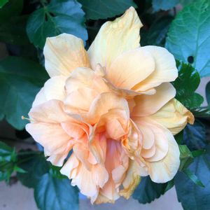 越冬組が咲かないので我慢しきれず、初夏に購入した八重のハイビスカス。淡いオレンジで美しいです。猛暑の間咲かなかったけど、暑さが落ち着いてきてまた咲き始めました。