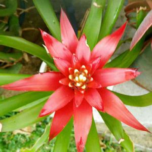 グズマニアという名前だったかな?買ったときはこんなに赤いのに太陽に当たりすぎかな?今は黄色です。