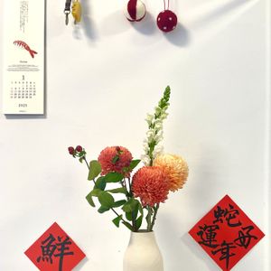 2025JAN27 旧暦新年らしい色で玄関を飾った。 🇹🇼大麗花.金魚花.金絲桃