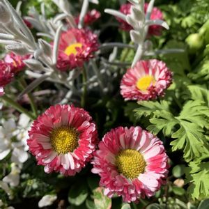 こんにちは☀️ ①今日の花デージー🌼 イングリッシュデージーです 我が家の玄関横 ここだけは冬でも緑が残り イングリッシュデージーは一年中咲きます♪ 手前のお花ちょっと黄色っぽくないですか? 黄色が好きだから黄色っぽくなってくれたのかな?💛 ②③⑤昨年末に植えた花たち🌸 やっと花数が増えてきました☺️ ④スカビオサ白ときどき桃🍑は白にはなりません😆 春っていいな〜〜🥰 ガーデニングは春までしかしない私です😁 楽しい日曜日をお過ごし下さいね☆