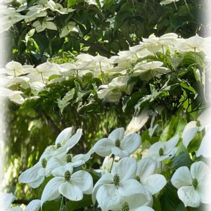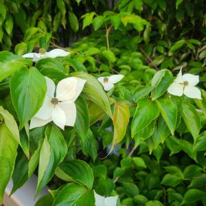 ヤマボウシ 真っ白のお花が綺麗🤍🤍 本当は枝いっぱいに真っ白になるのだけど😅 私が適当な剪定で チラホラのお花が咲きました😳 イベーと枝垂れ梅の間なので混み合ってヤマボウシさんに小さくなってもらいました🤣 咲いてくれて良かった