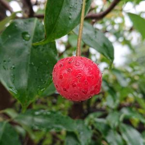 ヤマボウシ 雨が降っている間に赤くなってきました 昨年GSで実が食べられると知って食べてみたんだった 味は微妙でした もうすぐ秋ですね