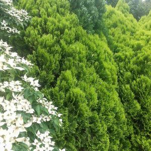 ヤマボウシの隣のコノテガシワ大きいでしょう。🌿🌸🍀🌸💚 緑が雨に映えて美しい😃💐💕