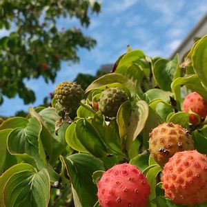 ♡いつもありがとうございます。(^-^)♪♪ 🏷️「雲仲間」 🏷️「土曜はお空の発表会」参加させて頂きます。 🧡❤️🌿 食用に出来る、丸く柔らかい実が熟して秋の気配を感じるこの頃です。♪♪ 《ヤマボウシ(山法師)》 *ミズキ科、ミズキ属の落葉高木。 ☆2022/9/10 撮影📱 ☆散歩道