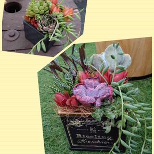 オーダーいただいた寄せ植えです。 1つ(右下)は オープン一周年記念の お祝いでお渡しするのと、 男性の方へ室内向けでカッコいい感じでと。 なかなか悩みました(笑) ええ刺激になり嬉しいです。 もうひとつは 退職される方への ミニギフトとゆう感じで。 こちらも男性の方なのですが、 なぜか 奥様が喜んでくれるかな?を 意識してしまいました(笑) でもでも ラッピングは お二つともシルバー×ブルーで やりましたよ(笑)