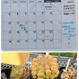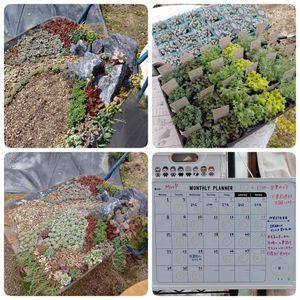 昨日も一輪車の続きを! まず昨日までの完成をチラッと ポイントは 岩の上からポイポイトレーのように流れる川ならぬ流れる小苗😄 苗はまだ足りない予感がありつつ とりあえず再スタート! ミセバヤ可愛いですよね~ 新苗が届き少し入れました😄 やっぱり苗が足りない。 ここまでの完成分です あと、 5月のカレンダーです。 だいぶハウスの中が 熱くなってきたので 天気の良い日は 夕方からの来訪をおすすめします! 夕方すずみに来るイメージで ゆる~くどうぞ😄