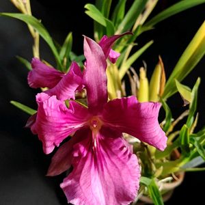 こんばんは!🌃 今年もデンファレ綺麗に咲きました!🩷 株分けして板付にしてます! 1枚目は朽ちてきた流木から剥がしてそのまま素焼き鉢に入れてるだけです!💪😅 4枚目はデンドロビウム ビギバム💜こちらも株分けしてますが咲いてるのは一株だけです!