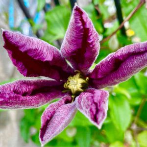 クレマチス ニオベが咲き出しました。まさにベルベットの質感🍷👄 「風と共に去りぬ」で、後ろ指さされると分かっているパーティーにスカーレットが着ていくドレスがこんな雰囲気の色で…見る人を圧倒する美しさでした。 私の中でこのクレマチスの名前はヴィヴィアン·リーです😅