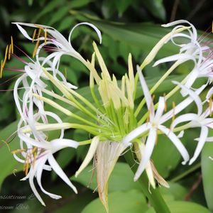 ハマユウのお花 ヒガンバナ科 葉が万年青のように見えるところから ハマオモトの別名で呼ばれる 白く細長い花びらが6本、先が紫色の雄しべ 甘い香りもあるようです