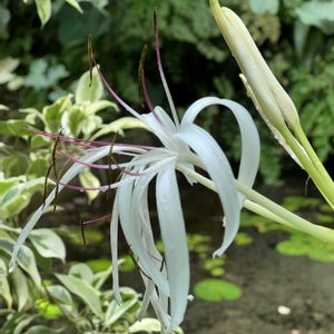 今日のお花 ハマユウ ①24.08閉園間近の市川万葉植物園にて まだ開花が始まったばかり 日一日と咲き進む様子を観測したいと思いましたが、連日の猛暑で足が遠のき、残念でした😢 アフリカハマユウ ハマユウのお仲間 鉄炮ユリによく似ています ②市川万葉植物園にて ③万葉植物園に通じる緑地にて 九十数段の途中にあり、いつもちょっと一息入れる場所💚
