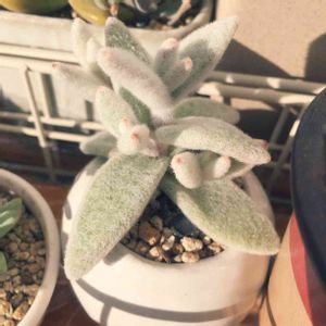買った当時は全体的に真っ白フワフワだったのに、段々と下の葉がへにょ〜となって来た。植え替え直後に急に冷え込んだので、根がうまく張れてないのかも…