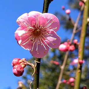 梅(ウメ) バラ科サクラ属の落葉高木。奈良時代の少し前に中国から渡来した。中国中部原産で古くから栽培されていた。庭や畑で栽培されるが、時に暖地で野生化している。花期は2~3月、春の花の先駆けとして寒中に咲く。 花の香りがよいのは成虫で越冬するハナアブなどを呼ぶため。メジロも蜜を吸いに群れで訪れ花粉を運ぶ。梅には花を鑑賞する『花梅』と果実を採るための『実梅』に分けられる。花梅には多くの園芸品種があり、紅梅や八重咲き、枝垂れなどを植えているのは梅園で、白花ばかりが咲き揃うのは果実を収穫するための梅林。また、梅には600種類以上の品種があるといわれるが、野梅系(やばいけい💬原種に近く果実が小さめ➡️甲州野梅、白加賀など)、緋梅系(ひばいけい💬枝の中の髄が紅色をしている。多くは紅花だが、たとえ白花でも枝を折って赤い材なら緋梅系➡️寒紅梅、鹿児島紅、唐梅など)、豊後系(ふんごけい💬アンズとの自然雑種で果実が大きい➡️南高、竜峡小梅など)の3つに大別できる。 果実ははじめ小豆粒ほどになるまで貯蔵養分で育つため、葉が伸びきらないのに果実が目につくのはそのせい。その後、2~3㎝のほぼ球形の核果になる。果実の片側に浅い溝があり、表面にビロード状の毛があり、6月頃に黄色く熟す。完熟直前の青い果実を塩漬けにした後、天日干しして赤ジソとともに漬け込んで作る梅干しは日本独自の健康食品。他にも梅酢や梅酒、菓子に用いられる。クエン酸、リンゴ酸、コハク酸などの有機酸を多く含み、健康食品として人気が高く、日本文化の中に広く浸透している。 中国では春の花木の代表といえば梅。中国文化の影響を強く受けた平安貴族も梅を愛し、平安時代以前は花といえば梅を指したが、その後は桜が取って代わり、鎌倉時代に花といえば桜を指すようになった。桜は満開を鑑賞するのに対して、梅は『梅一輪』という言葉があるように一輪でも鑑賞するところがある。また、花の時期に合わせて『探梅(咲き始めの時期)』『賞梅(見頃の時期)』『送梅(咲き終わりの時期)』という言葉もある。 奈良時代かそれ以前に、青梅を燻製にした生薬『烏梅(うばい)』が中国から渡来した。風邪、吐気止めなどに効ありといわれ、日本で必要になったので、種か苗木を中国から取り寄せて植え、烏梅の木といったところ、梅の樹名になった。他には、梅の中国読み『ムイ』とか『メイ』の転訛など、名前の由来には異説が数多い。 出典『都会の木の花図鑑』『日本有用樹木誌』『散歩で見かける街路樹 公園樹 庭木図鑑』『日本の樹木』『ウメ ハンドブック』