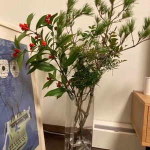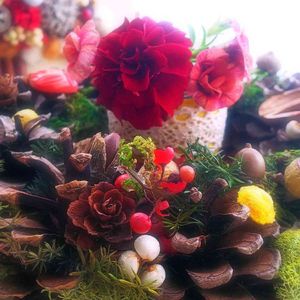 「今日のお花」の「千両」を使った、オーナメントです。おうちの中や、庭にある材料で作りました。撮影後、ガーランドとして楽しんでいます。雪の下や軒下で凍った植物が、復活してくれることを願っています。
