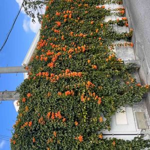 カエンカズラの家 今日の豊見城市饒波にて,壁面がカエンカ ズラに覆われている家があります。 和名の火炎かずらはオレンジ色🧡の花の 群れが、炎🔥のように見えることに由来 します。沖縄では暑さをしのぐために壁面 緑化として利用されています。 🧡(((o(*゚▽゚*)o)))♡🧡