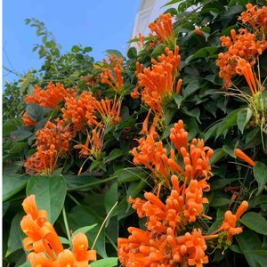 カエンカズラ 花が群れて咲く様子が炎のように見えることから名前がついたそうです 高いところから降り注ぐオレンジの花が とても美しくて目を奪われました🧡