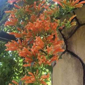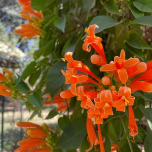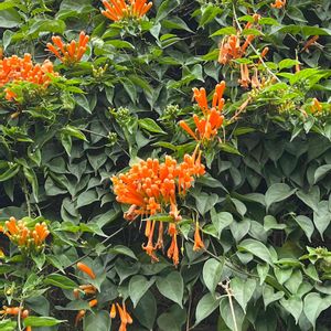 🔥火焔葛(かえんかずら) (オレンジトランペットバイン) 先日📬した生態系公園の温室で横4〜5mのパネルに絡んでたくさんの房が並んでいました🥰 今日のお花《スイカズラ》の親戚になるでしょうか🤭
