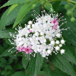 小花の長い蕊で、烟る(けぶる)ように見えるシモツケ。白花とピンク色の花が混ざる『源平シモツケ』という種類のようです😃若木の頃は白い花が多く、年数が経つとピンク色の花が増えるそうです。挿木は白花の枝でするのが良いとのことです。