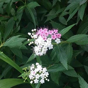 公園にて、シモツケかしら。 一つの枝から紅白❗️って珍しいのでは❓️🤔