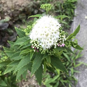源平シモツケ 昨年、小さな挿し木の苗をお迎えして 花壇に植えました。 ちっとも大きくならなかったんですが、 今年になって、春から少しづつ伸びて やっとお花を咲かせ始めました❣️ まだ白いお花ですが、右の方に少しピンク色が見えてます💖💖 早くピンクも咲いて🙏🙏🙏