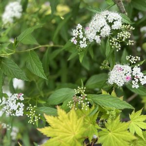 こんにちは👋😃 源平シモツケが咲き始めました❇️ 昨日迄は蕾のみでした😊 バラ科シモツケ属の落葉低木 1株から白🤍と淡紅色とを咲分け、 「源平」とは、紅白の花色を源平の旗色に見立てたもの。 紅白混じった花も咲きます💓🤍❤️