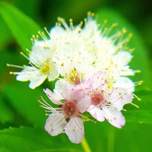 花壇にシモツケが咲いていたんだけど、白いシモツケの真ん中だけピンク色してる🌸!? 白は白、ピンクはピンクじゃなくて白からピンクに🤔??? 全体的には白いものの中にピンクのがひとつだけ咲いて並んでいるのも発見。 でも、綺麗ー✨