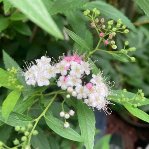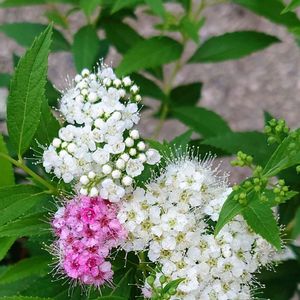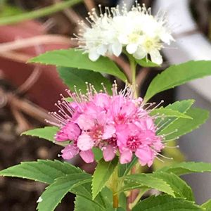 下野 シモツケ 初めてこの花を見た時は 衝撃的でした🤩 同じ木から白とピンクの 花が咲くとは~! 去年は虫被害がありましたが、 今年はキレイに咲いてくれてます🙂