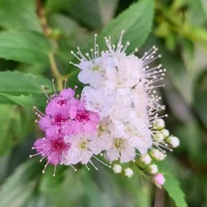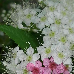 源平シモツケ💗 今年は枝葉の成長ばかりがすごくて🌿 白花🤍源氏優勢🏳️だった😔 枝をすっきり、さっぱりさせたら✂️ 来ました来ました、源平咲き💗💗😆✴️🙌 さっきわかったことですが 若い樹は白が強く、年数を重ねるとピンクも出る 挿木には、白い花 の咲く枝がいい コデマリやユキヤナギと違い、前年枝を剪定すると、何度も枝先に花を咲かす とのこと! お花終わったら、またカットしなくちゃ~😊🎶
