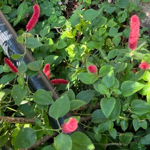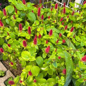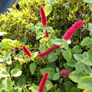 キャットテール トウダイグサ科 アカリファ属 3年目のキャットテールです グンと株が大きくなり お迎えした頃の3倍くらいに立派になりました 1枚目は昨夜リビングで撮りました 照明に照らされて赤いロウソクの炎のように綺麗です 2枚目は今朝 玄関前のベンチで撮りました