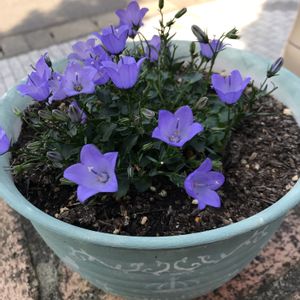 カンパニュラ メリーベル 一番お気に入りのお花です💕 強健で開花期間が長いことが特徴で、初秋まだ次々と咲くそうです。 耐寒性多年草 玄関の日が一日中当たるところに置いてます。 ポットにある育て方の紙を見ると、雨の当たるところや夏の強い直射日光を避けると良いと書いてあるので、もう少し暑くなったら、玄関の少し日陰に移動しようかと考え中… 直径21センチの鉢です。 肥料は2〜3週間後に追肥とあるので、その頃にあげようかと思ってます。